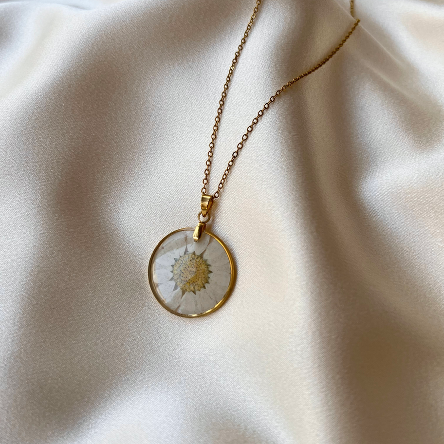 Este collar con una Flor margarita real encapsulada es un recordatorio de la belleza en lo simple. Perfecto para darle un toque fresco a tu día.